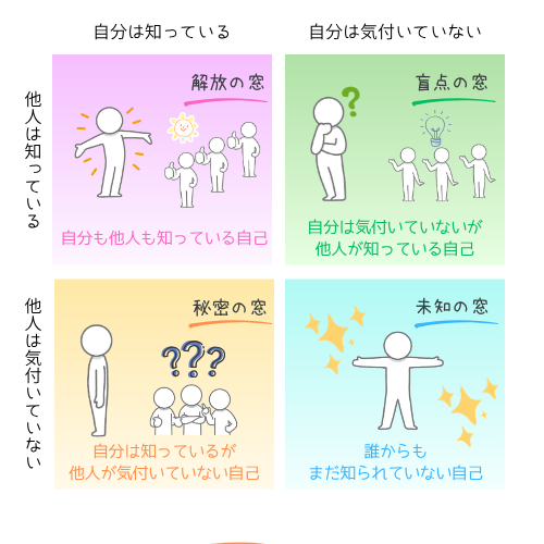 - 自分は気づいていないが、他人は知っている自分(盲点の窓)